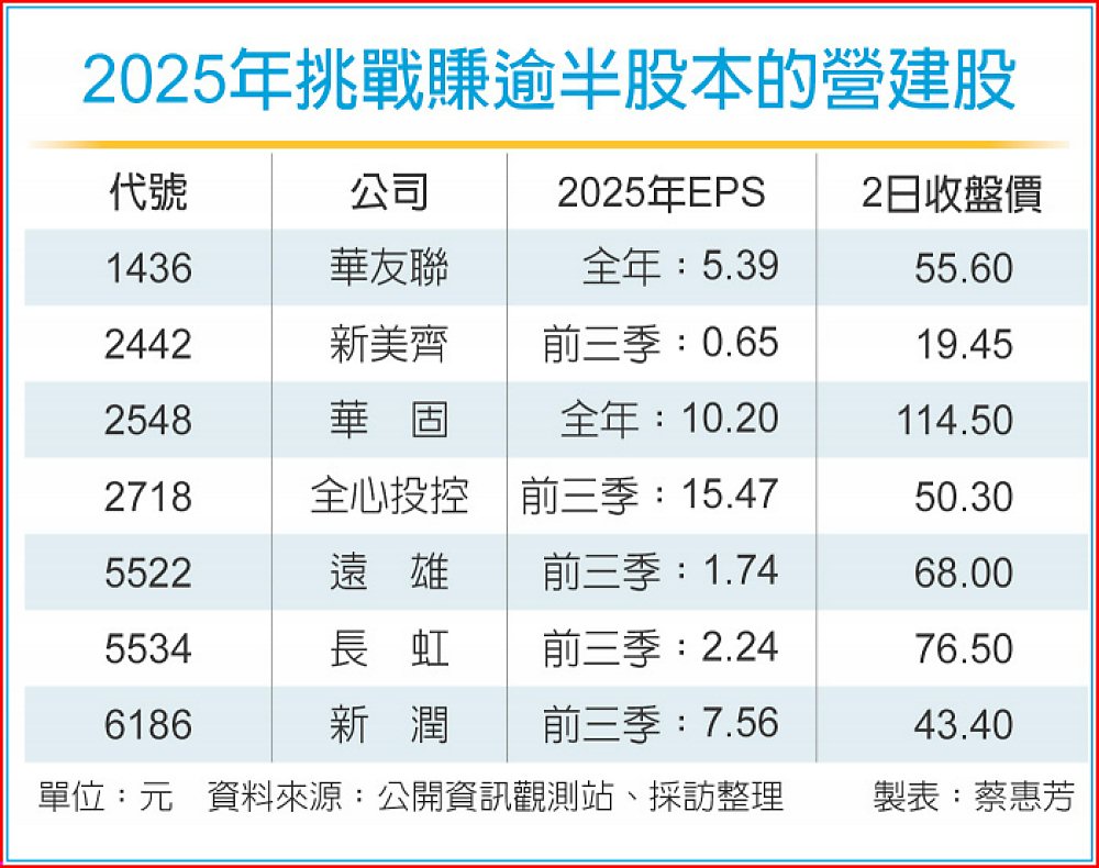 上市櫃建商紛紛迎接完工交屋潮,繼華友聯(1436)去年每股稅後純益(EPS)達5.39元,華固(2548)第12度大賺一股本後,市場預期全心投控(2718)將挑戰獲利1.5個股本,新美齊(2442)、遠雄(5522)、長虹(5534)、新潤(6186)等,去年都有望賺進至少半個股本的好成績。