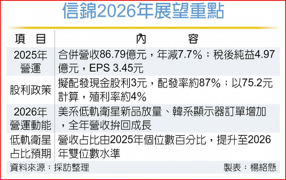 信錦對2026年營運抱持審慎樂觀看法。公司指出,低軌衛星需求擴張,多項新專案陸續導入,將推升太空衛星相關產品營收規模,並強化產品組合結構。