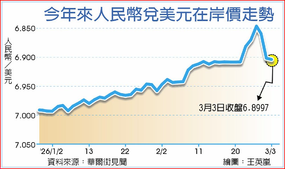 未料美以攻擊伊朗的行動,導致全球避險風氣升溫,美元指數急升,人民幣在岸價2日夜盤已貶至6.9元區間,陡峭的貶值曲線逼得人行不得不出手干預。