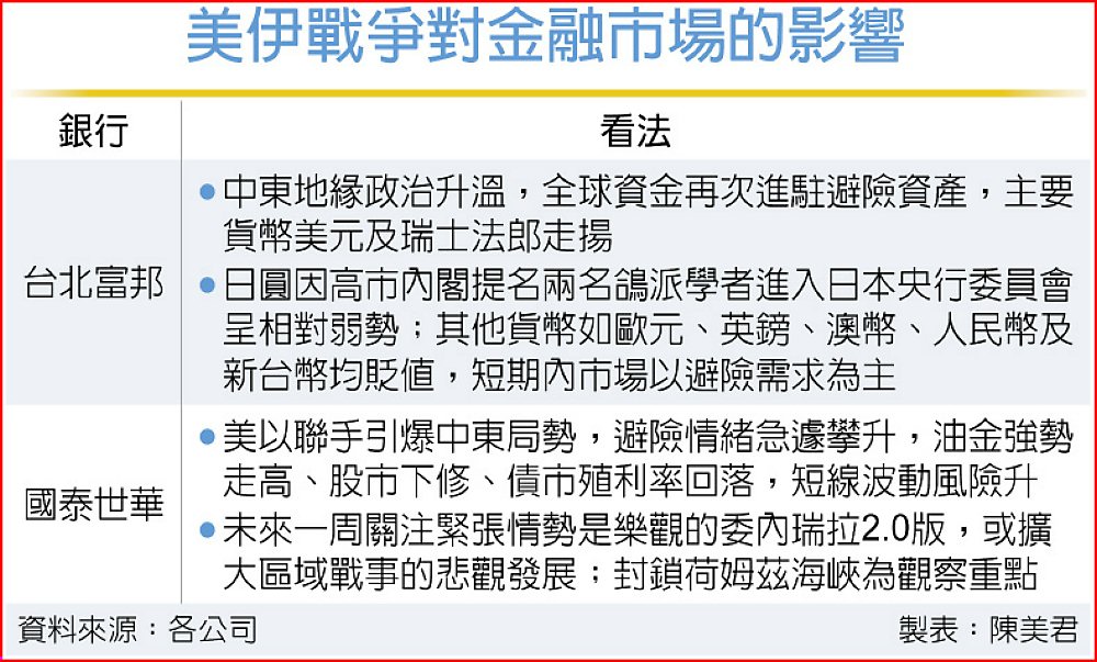 台北富邦銀行投資研究部最新報告指出,中東地緣政治升溫,是全球資金再次進駐避險資產的主要原因,代表性貨幣為美元及瑞士法郎,雙雙走揚;日圓因高市內閣上周五提名兩名鴿派學者,進入日本央行委員會,呈相對弱勢,其他主要貨幣,包含歐元、英鎊、澳幣均走貶。