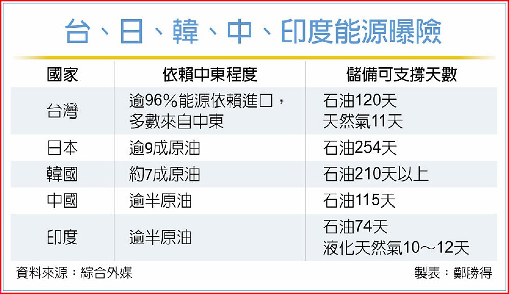 台灣逾96%的能源仰賴進口,多數來自中東。台灣約6成石油與三分之一天然氣經荷姆茲海峽運輸而來。沙烏地阿拉伯是台灣最大石油供應國,至於液化天然氣則有四分之一來自卡達。台灣經濟研究院負責能源安全研究的研究五所所長陳詩豪表示,台灣石油儲備約可支撐120天,但天然氣僅約11天。
