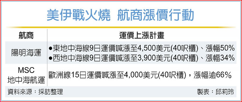 美以伊戰火升級阻斷紅海航線,從遠東、印巴到埃及、土耳其等國貨載移轉效應逐步顯現,地中海航線可望率先迎轉單。貨代業傳出,陽明海運開出地中海線漲價第一槍,9日東地中海線每40呎櫃運價喊漲至約4,500美元、漲幅50%,西地中海線每40呎櫃運價喊漲至約3,900美元、漲幅34%。