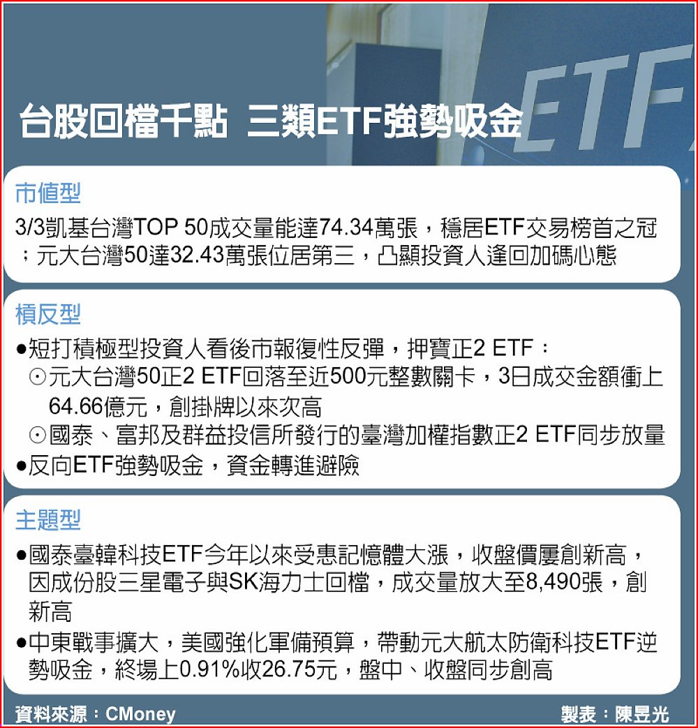 中東戰事升溫,台股3日帶量下殺,近兩日回檔千點,增益、避險等交易策略的ETF買盤加速啟動,鎖定市值型、槓反型及主題型三類ETF搶進,成交同步放量。