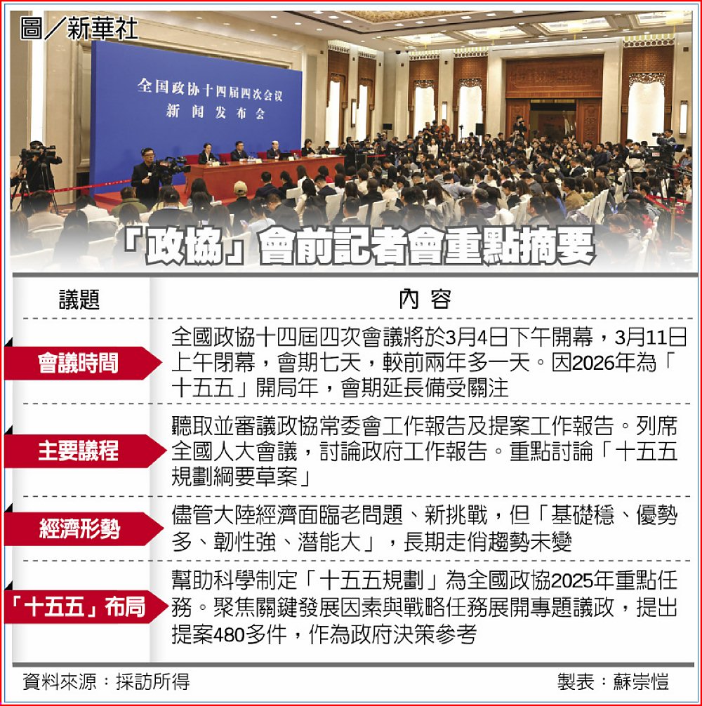 針對「十五五規劃」,劉結一表示,政協已聚焦「十五五」時期關鍵發展與戰略任務展開專題議政,提出提案480多件、提報資料200多篇,並針對「十五五規劃」建言,向中共中央、大陸國務院提交專題報告,作為決策參考。