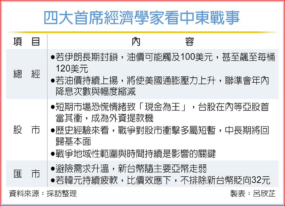 美伊戰火持續延燒,引發全球金融市場劇烈震盪。金融業首席經濟學家認為,油價上揚恐改變今年全球通膨持續放緩的原先預期,並牽動聯準會(Fed)降息路徑;短期而言,市場恐慌情緒將導致「現金為王」,台日韓等今年漲幅較大的亞股首當其衝,淪為提款機。但經濟學者也強調,台股基本面未改變,若戰事在短時間內緩和,預期衝擊有限。