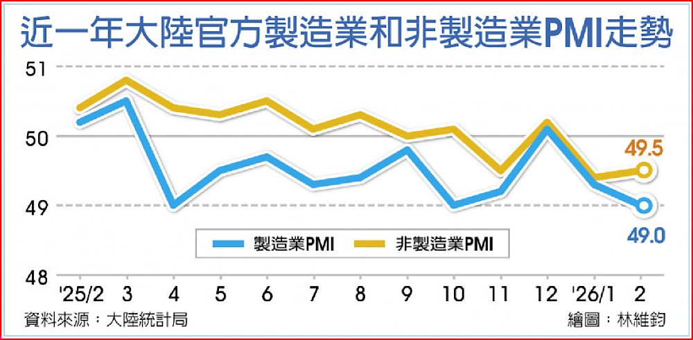 經過2月春節假期,大陸官方製造業和非製造業採購經理人指數(PMI)連續兩個月收縮。大陸統計局4日公布,2月大陸製造業PMI降至49,月減0.3點,非製造業PMI為49.5,上升0.1點,但兩者皆遜於預期。專家分析,大陸經濟下行壓力仍存。