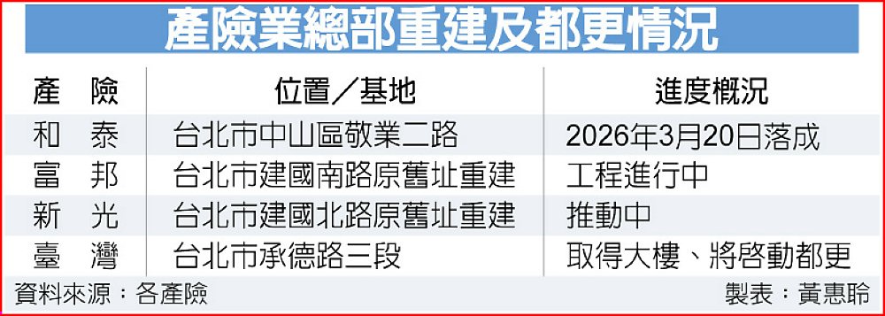 新光產險、臺灣產險也陸續推進都市更新或重建計畫,臺產是去年花20億元在台北市承德路三段購置大樓。臺產說明,即將推動都更程序取得改建獎勵容積,興建符合綠色標章與智能化新總部大樓,一方面能舒緩目前已趨於飽和之辦公空間,且能滿足中長期業務成長空間使用,另一方面提升企業形象與社會責任。