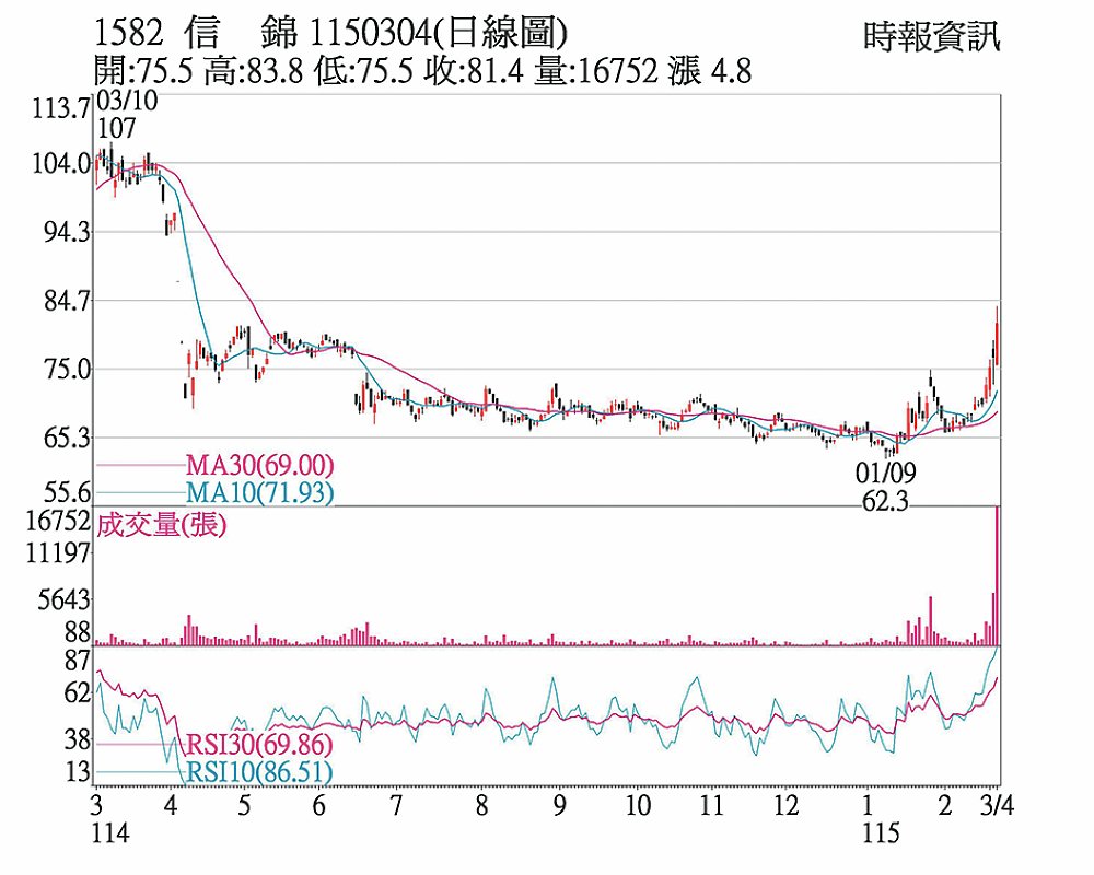 信錦(1582)股價沿5日線強攻,4日以75.5元開出,震盪後一度衝高至83.8元,終場以81.4元作收,漲幅6.27%,創近期波段新高,近期急漲牽引所有均線向上,成交量明顯放大至逾1.5萬張,惟強攻後出量留上影線,留意短線震盪。