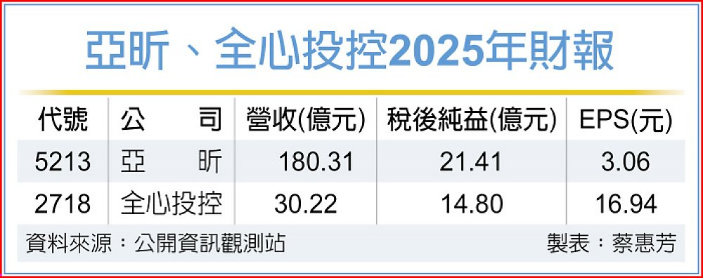 全心投控(2718)去年營收30.22億元、稅後純益14.80億元,均創歷年第二高紀錄,EPS達16.94元。