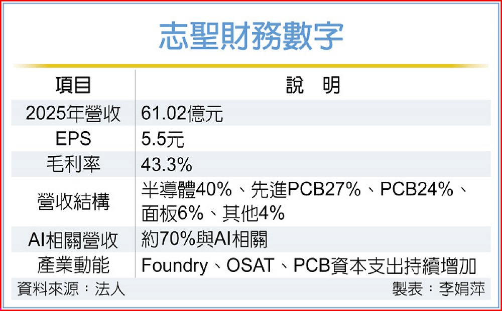 法人指出,由於晶圓代工(Foundry)、封測(OSAT)與PCB廠資本支出近年同步擴大,挹注志聖營收。PCB客戶投資規模已由過去約20億元提升至逾百億元;晶圓代工廠整體資本支出亦可能達560億元,其中,約10%至20%投入先進封裝領域。