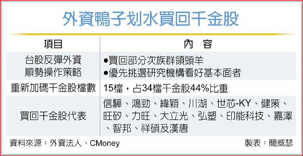 加權指數5日反彈2.57%,收回部分4日的重挫跌幅,觀察國際資金動向,並未因反彈而全面回頭加碼台股,而是持續調節台股約515億元,儘管看似還在大舉出逃,卻鴨子划水默默買超近半數的千金高價股,預留後續彈升的想像空間。
