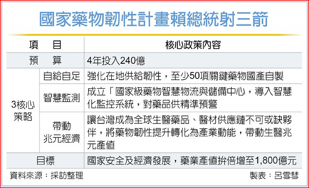 總統賴清德5日宣布,政府將投入240億元,推動為期四年「國家藥物韌性整備計畫」,政府將聚焦三大核心策略,包括自給自足,強化在地供給韌性;成立「國家級藥物智慧物流與儲備中心」完善監測調度;將藥物韌性提升,轉化為領航「健康台灣」產業動能,帶動兆元生醫產業經濟。其中,至少50項關鍵藥物將國產自製。