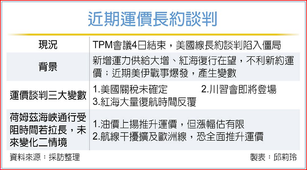 據了解,已簽訂歐洲線今年長約價下修,部分貨代業原估美國線今年長約價也會下修,理由是艙位供給過剩、市場不確定性高,孰料美伊開戰,船公司撿到槍,多拖一天愈有機會推高運價翻盤,目前印巴、南美、歐地等航線都上漲。