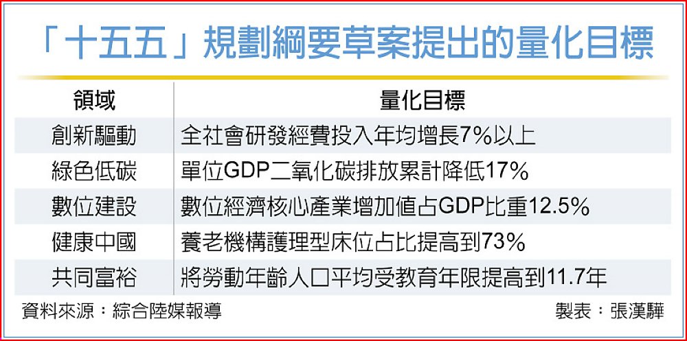 與此同時,大陸積極發展科技產業創新驅動,圍繞創新投入及其成效提出三項指標。其中,充分考慮研發投入增長趨勢和企業投入能力,提出全社會研發經費投入年均增長7%以上,與「十四五」規劃目標保持一致,確保研發投入力度不減。