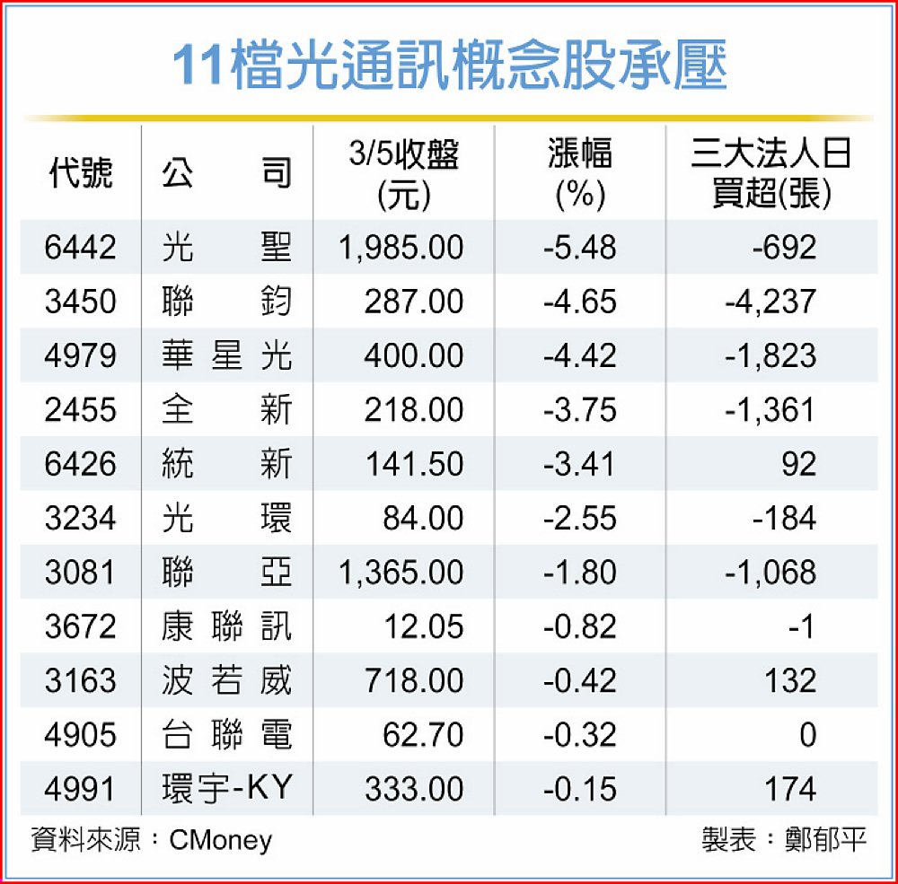 受到消息面利空打擊,台股光通訊族群5日慘遭滑鐵盧,儘管台股展開技術性反彈,光聖、聯鈞、華星光、全新、統新、光環、聯亞、康聯訊、波若威、台聯電、環宇-KY等多檔光通訊概念股逆勢走弱。