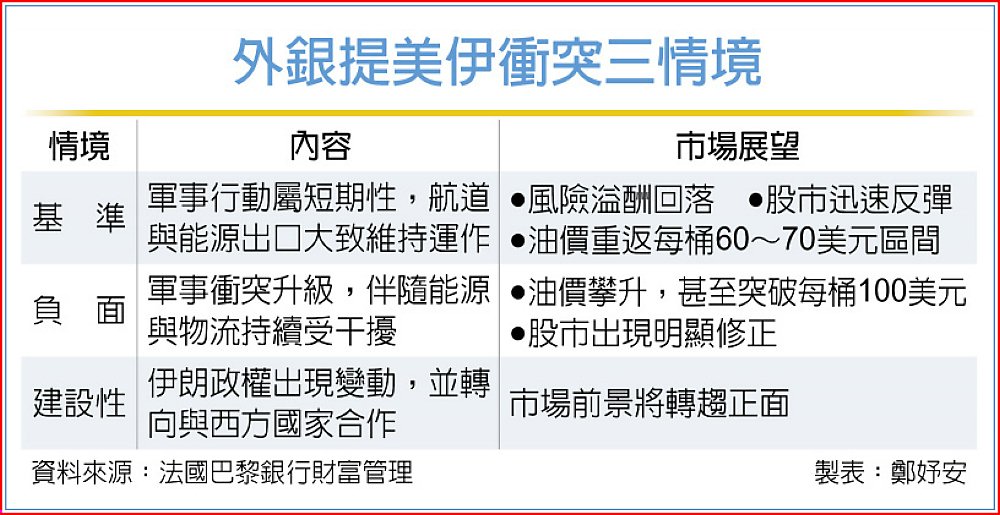 法國巴黎銀行財富管理分析三種可能情境。一是基準情境,研判軍事行動屬短期性,僅持續數日或數週,情勢可望快速落幕,不會出現政權更迭,也不致造成長期能源中斷。雖短期軍事與政治不確定性偏高,但航道與能源出口大致維持運作。隨著緊張情勢緩和,市場風險溢酬將回落,油價可望重返近期每桶60~70美元區間,股市也有望迅速反彈。