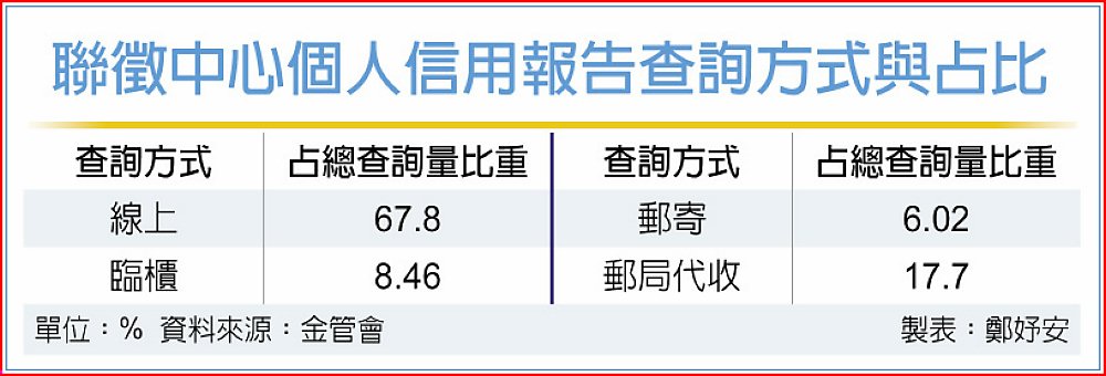 銀行局官員說明,目前申請方式是以線上申請較多,以去年統計為例,線上查詢占總查詢量的67.8%,臨櫃為8.46%,郵寄申請6.02%,郵局代收17.7%。去年整體查詢量達82萬2,946件,線上達55萬7,979件。