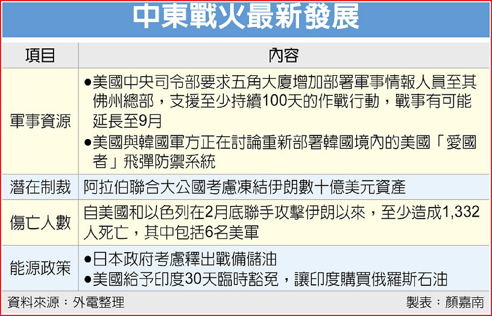 中東衝突持續擴大,美國國防部正為美伊戰事調派更多資源。美國中央司令部要求五角大廈增加部署軍事情報人員至其佛州坦帕(Tampa)總部,支援至少持續100天的作戰行動,且戰事有可能延長至9月,代表美伊戰事恐比美國總統川普先前預估的4至5周來得更長。