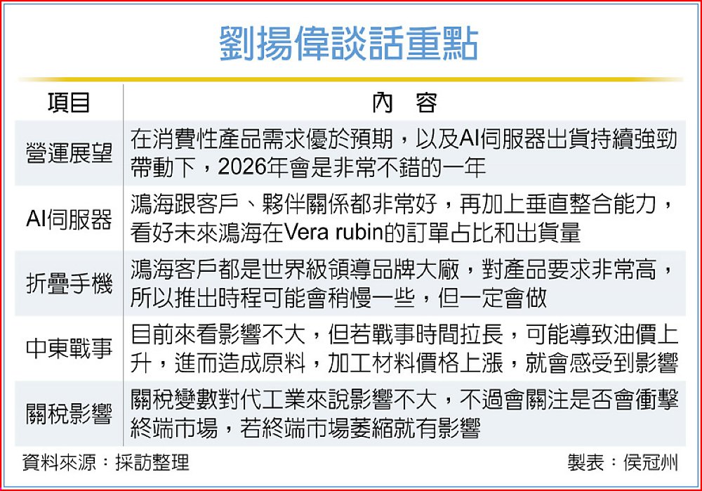 劉揚偉也提到,在今年GTC大會上,將會送輝達(NVIDIA)執行長黃仁勳與Vera Rubin平台有關的「特別禮物」。當然,鴻海也會展示與Vera Rubin平台相關的方案,包括機櫃(rack)、運算托盤(Compute Tray)和散熱與電源相關零組件等,呈現鴻海在AI伺服器領域從系統到關鍵零組件的垂直整合能力以及在精密加工方面的實力。