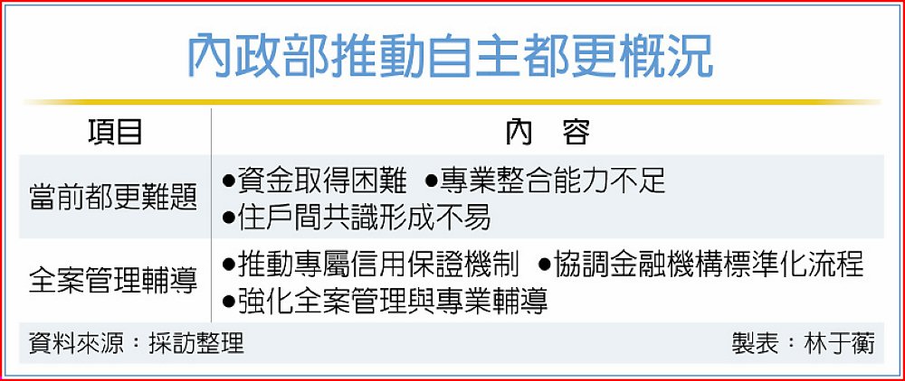 內政部將研議建立專業輔導機制,透過「全案管理機構」協助住戶自行主導整合、加速都市更新。內政部6日表示,將以推動專屬信用保證機制在內的三項具體作法落實,預計投入5億元預算提供都更信保基金,針對自主都更以「更新會」為名義者,由中央以10倍擔保、50億元額度,支持自主都更。