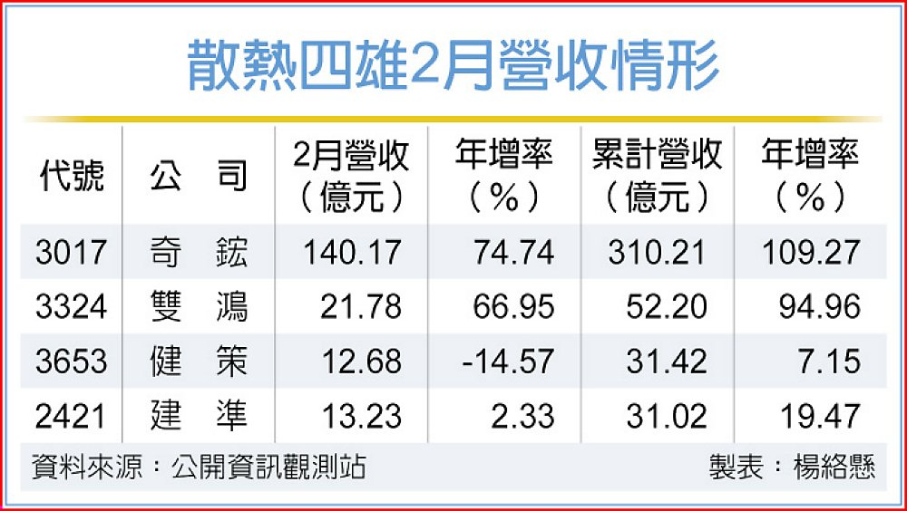 散熱四雄陸續公布2月營收,受農曆年假期及工作天數減少影響,各廠單月營收較上月回落,但奇鋐(3017)、雙鴻(3324)及建準(2421)同步寫歷年「最強2月」紀錄。隨液冷散熱解決方案滲透率提升,AI伺服器平台導入新世代架構,預期散熱族群第一季營收可望維持成長動能。