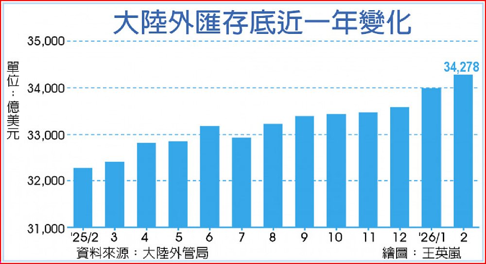 大陸外匯管理局7日公布最新外匯存底數據,截至2026年2月末,大陸外匯存底規模為3.43兆美元,較1月末上升287億美元,且創十個月新高。此外,中國人民銀行仍將增持黃金做為主要方向,2月大陸黃金儲備月增3萬盎司至7,422萬盎司,連續16個月增持黃金。