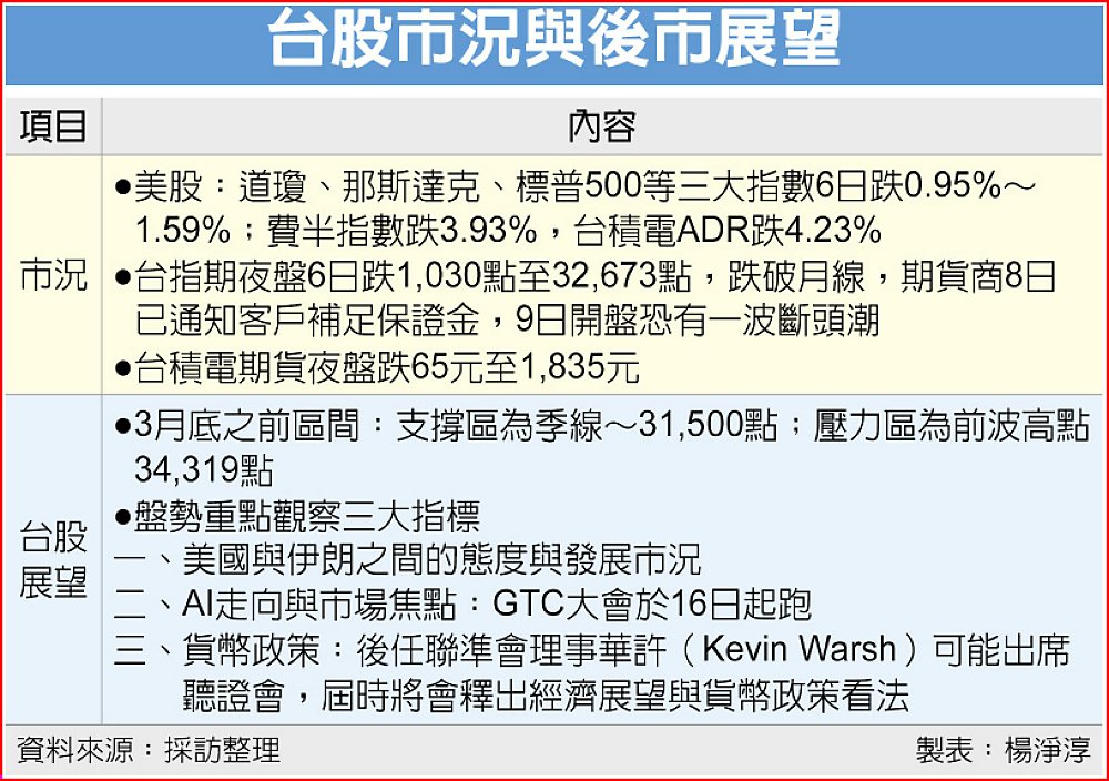 美伊戰爭尚未平息,紐約原油期貨6日飆漲12.81%,收91.39美元,布蘭特原油期貨亦漲9.43%,收93.47美元,高油價引發股市拋售潮,美股四大指數回檔0.95%~3.93%,台指期6日夜盤重挫1,030點,至32,673點,9日八大公股行庫、投信及政府基金將備戰。
