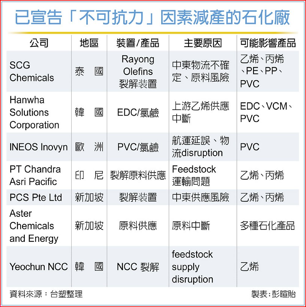 美伊衝突延燒未歇,繼韓國輕油裂解巨擘-麗川YNCC率先宣布因不可抗力因素減產後,催化亞洲石化行情喊漲氛圍,目前又再添歐洲、韓國、泰國、印尼、新加坡等六家石化廠跟進宣告減產,牽涉產品供應包括乙烯、丙烯、聚乙烯(PE)、PP、PVC、EDC、VCM產品,恐進一步拉升塑化報價攀揚力道。