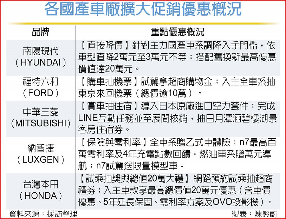 福特六和則主打入主全車系抽東京來回機票,並加碼舊換新優惠與高額零利率;中華三菱針對新款國產休旅XFORCE推出日本原廠空力套件,並祭出賞車試乘抽涵碧樓住宿券等活動;台灣本田祭出試乘抽超商禮券及最高20萬優惠;納智捷針對n7純電休旅及燃油車系打出贈送乙式車體險及百萬零利率等優惠。