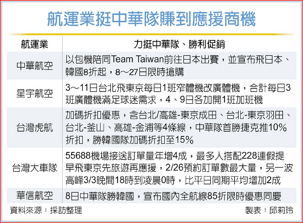 航運業從空中到陸上力挺中華隊征戰世界棒球經典賽(WBC),服務熱血球迷,也賺到應援商機。3月傳統空運淡季不淡,日本線獨強,繼中華航空以包機陪同Team Taiwan前往日本出賽,星宇航空在3至11日WBC預賽期間超前部署,將台北飛東京成田的窄體機改為廣體機,合計每日3班廣體機滿足台灣球迷赴日應援的需求,4日、9日還各加開1班廣體加班機。