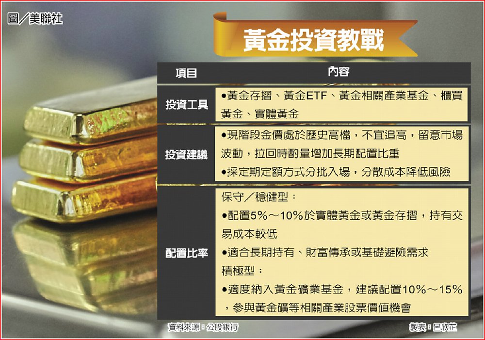 配置比例方面,土地銀行建議,投資人可採核心衛星策略,並運用分批布局降低波動風險。投資屬性偏保守或穩健型的投資人,可配置約5至10%於實體黃金或黃金存摺,持有交易成本較低,適合長期持有、財富傳承或基礎避險需求;投資屬性較積極的投資人,則可適度納入黃金礦業基金,建議配置10%至15%,參與黃金礦等相關產業公司股票價值的機會。