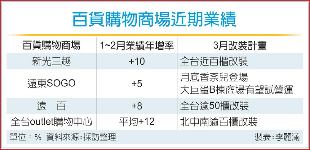 3月進入百貨業改裝季,包括新光三越等全台計有100多個櫃位調改與新櫃登場,加上今年的WBC帶動運動風潮,及春裝春妝上市等,均有助3月業績持續往上,業界看好開春第一季業績往上機會大。