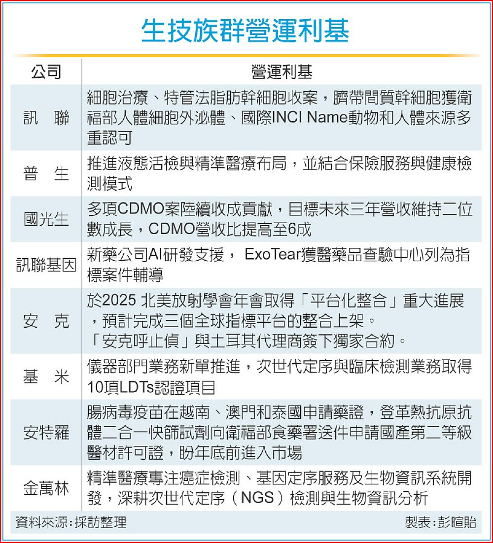 高齡化趨勢,加速催化健康養生商機,加上政策支持助力,生技族群的訊聯、訊聯基因、金萬林、普生、基米等,透過自身部署與策略結盟方式,全面搶進外泌體、檢測、AI應用商機。