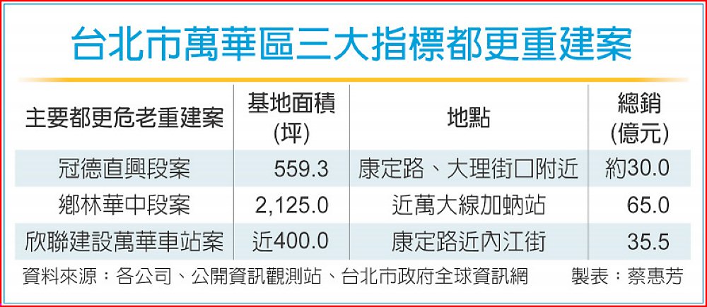 受惠台北車站C1D1雙子星捷運聯合開發案、捷運萬大線等重大建設紅利舖路,今年北市三大都更危老案將匯集萬華區,包括總銷35.5億元冠德直興段案、65億元鄉林華中段案、30億元欣聯建設萬華車站案,將同台吸客,可望推升萬華房價補漲動能。
