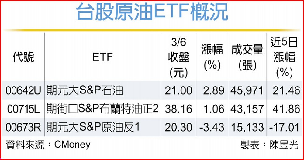 美伊戰爭戰線持續擴大,推升國際油價大漲,台股6日石油相關ETF大漲,期元大S&P石油ETF(00642U)上漲2.89%,近5日累計成交量已來到29.55萬張,周量創下2020年以來新高;期街口布蘭特正2 ETF(00715L)也同步帶量上漲1.06%,躍居盤面焦點。
