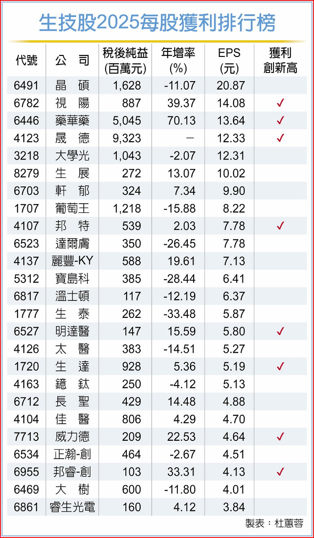 生技業去年受匯損和景氣波及,整體獲利雖不如2024年出色,不過整體營運表現仍算穩健;初估獲利王應還是尚未公布的保瑞(6472),其次是每股稅後純益(EPS)達20.87元的晶碩(6491),另由於美時(1795)、泰博(4736)、雙美(4728)、望隼(4771)、精華(1565)、杏昌(1788)、大江(8436)等尚未揭露財報,是否會出現大洗牌備受關注。