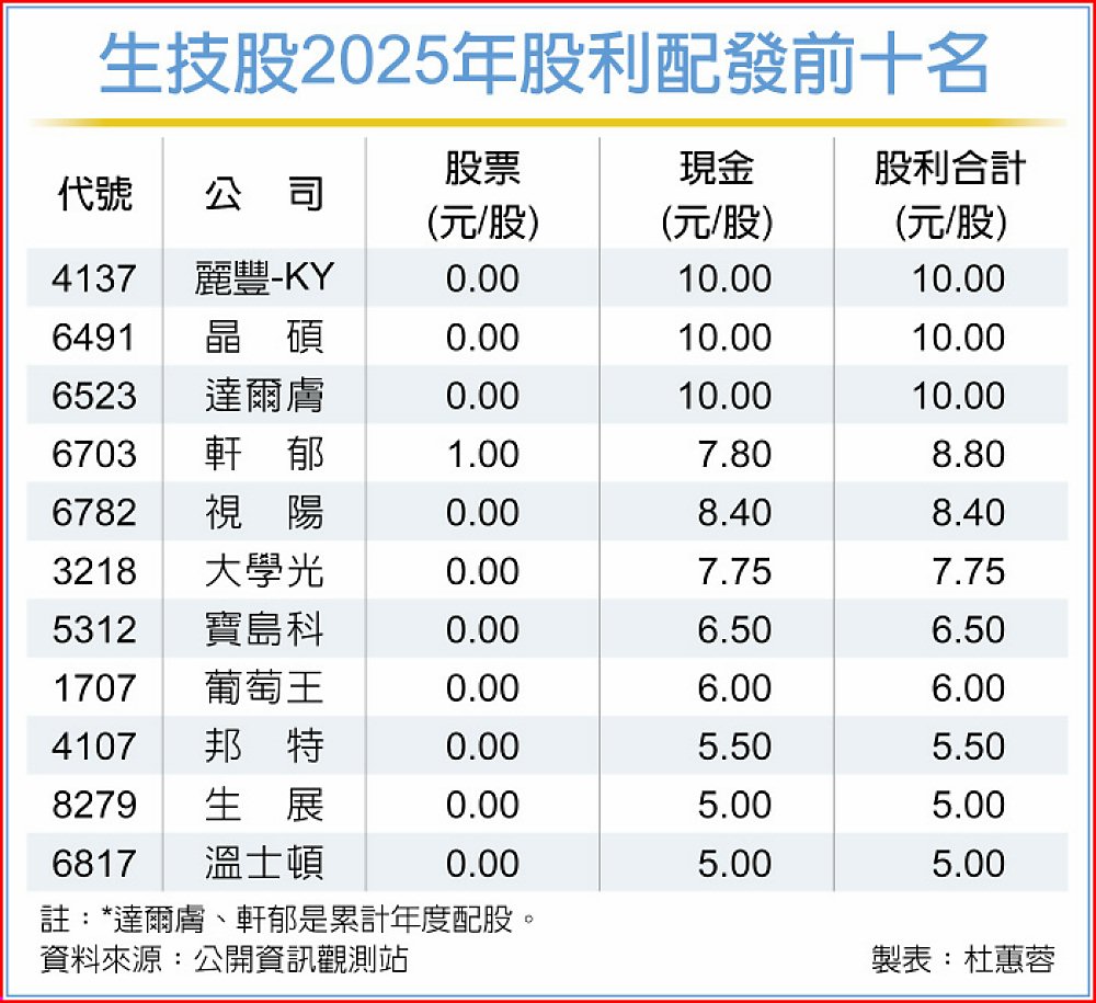 生技公司2025年配息表現亮眼,在已公布股利政策的公司中,麗豐-KY(4137)、晶碩(6491)、達爾膚(6523)均擬配發現金股息10元,並列生技配息王。另,麗豐、達爾膚、寶島科(5312)、正瀚-創(6534)董事會通過股利金額均高於去年每股稅後純益(EPS),突顯公司看好今年營運。