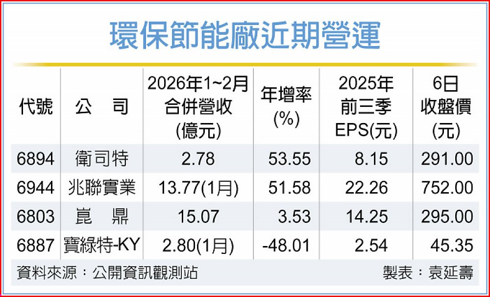 全球ESG趨勢助力環保節能商機拓展,加上美國對等關稅激勵科技產業赴歐美設廠,國內具海外拓展業務實力的環保節能廠崑鼎(6803)、寶綠特-KY(6887)、衛司特(6894)、兆聯(6944)等,市場預期,這些廠商今年海外工程訂單案量可望成長。