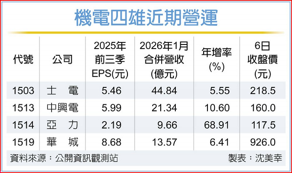 台電強韌電網計畫再釋出訂單,士電(1503)、中興電(1513)、亞力(1514)、華城(1519)等機電四雄皆有斬獲,訂單能見度至少看到2028年,其中士電、華城各拿下30多億元訂單成為這波贏家。