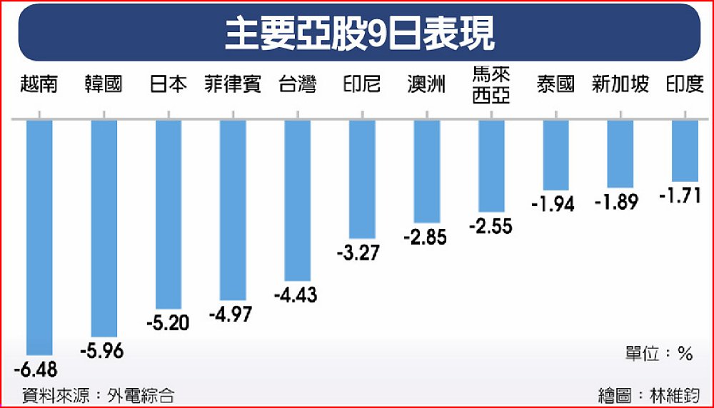 另外,越南股市VN30慘跌6.48%,菲律賓股市跌幅逼近5%。印度股市跌勢最輕,跌幅也達1.7%。