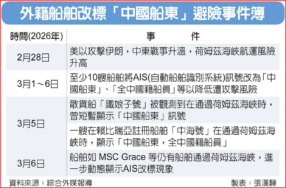 美以聯手攻擊伊朗,中東戰雲密布,航運安全風險大增,但與伊朗關係密切的中國大陸,似乎多了一層保護傘。繼5日「鐵娘子號」(Iron Maiden)將標識改為「中國船東」而順利通過荷姆茲海峽後,上周末又有一艘散裝貨船「Sino Ocean」號以此方式,通過荷姆茲海峽水道。