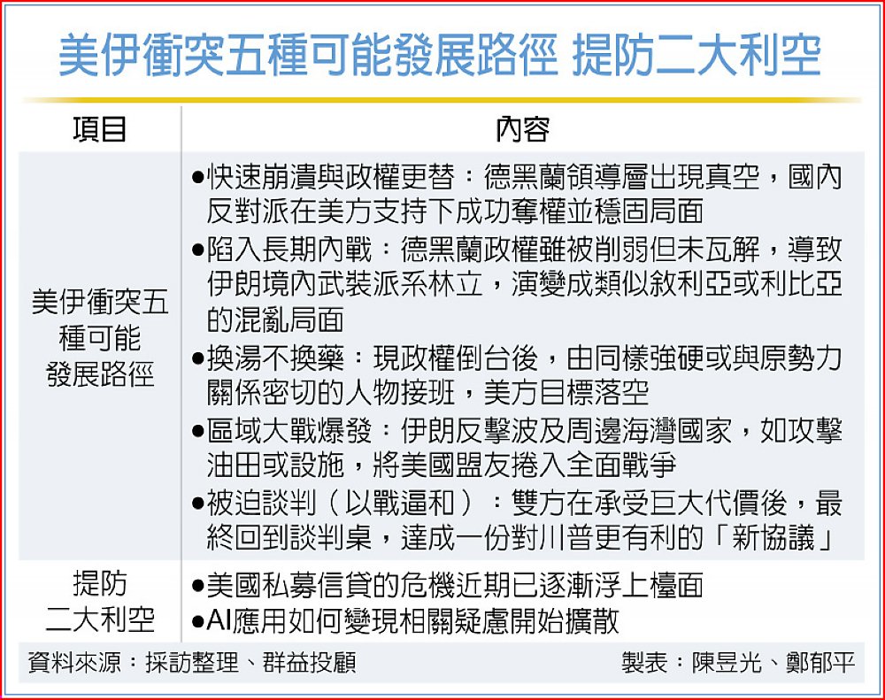 上述五種路徑中,只有快速崩潰與政權更替及被迫談判兩種結果對川普有利,其他三種皆會拉長中東衝突時間,影響波斯灣能源供給與價格,因近期油價飆漲,市場更擔憂局勢往不利方向發展。