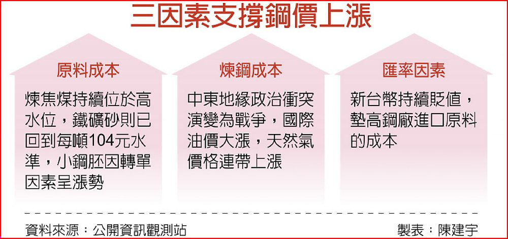 帶動近期鋼價上攀的原因,則是原物料價格持續上漲,煉焦煤持續位於高水位,鐵礦砂則已回到每噸104元水準,鋼廠的生產成本增加,也支撐鋼價繼續上漲。第二則是中東的地緣政治動盪,戰爭使得國際油價大漲,連帶天然氣也跟著上漲,另外海運費用也增加,都墊高鋼廠的生產成本。