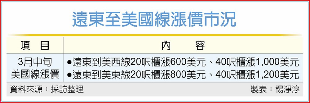 基於美國航線運力供給緊俏,航商最新已對國內外的貨代業者發出3月中旬的美國線全面漲價通知,其中遠東到美西線20呎櫃再漲600美元、40呎櫃漲1,000美元;遠東到美東線20呎櫃漲800美元、40呎櫃漲1,200美元,屆時美西線20呎櫃現貨價格超過2,500美元,美東線20呎櫃現貨價格超過3,500美元。