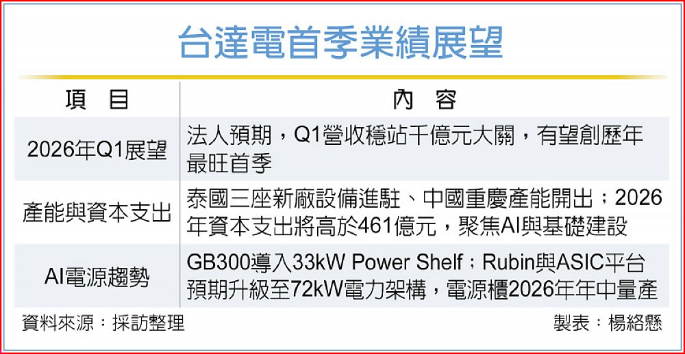 就目前營收表現與訂單能見度觀察,法人推估,台達電第一季營收可望與去年第四季大致持平,甚至不排除出現微幅季增。不過,液冷專案因去年基期較高,短期營收認列節奏出現差異,加上工作天數因素,部分事業群表現可能呈現季減。