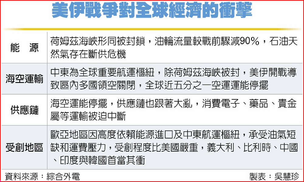 美伊開戰進入第二周,對全球經濟的衝擊已從油氣市場擴散到海空運輸,供應鏈也跟著大亂。美媒報導分析指出,高度仰賴能源進口及中東航運樞紐的歐洲與亞洲受創尤深,亞洲國家又以中國、印度和韓國首當其衝。