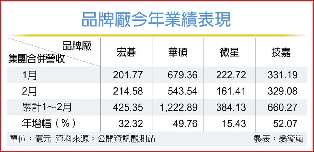 記憶體報價飆漲影響發酵,品牌廠宏碁第一季受商用PC急單推助,近2月業績維持雙位數增長,2月營收更達年月雙增成績。另以消費性PC為主力的華碩、微星,皆因2月工作天數縮減受累,但2月業績也分別達到歷史同期新高及次高表現。