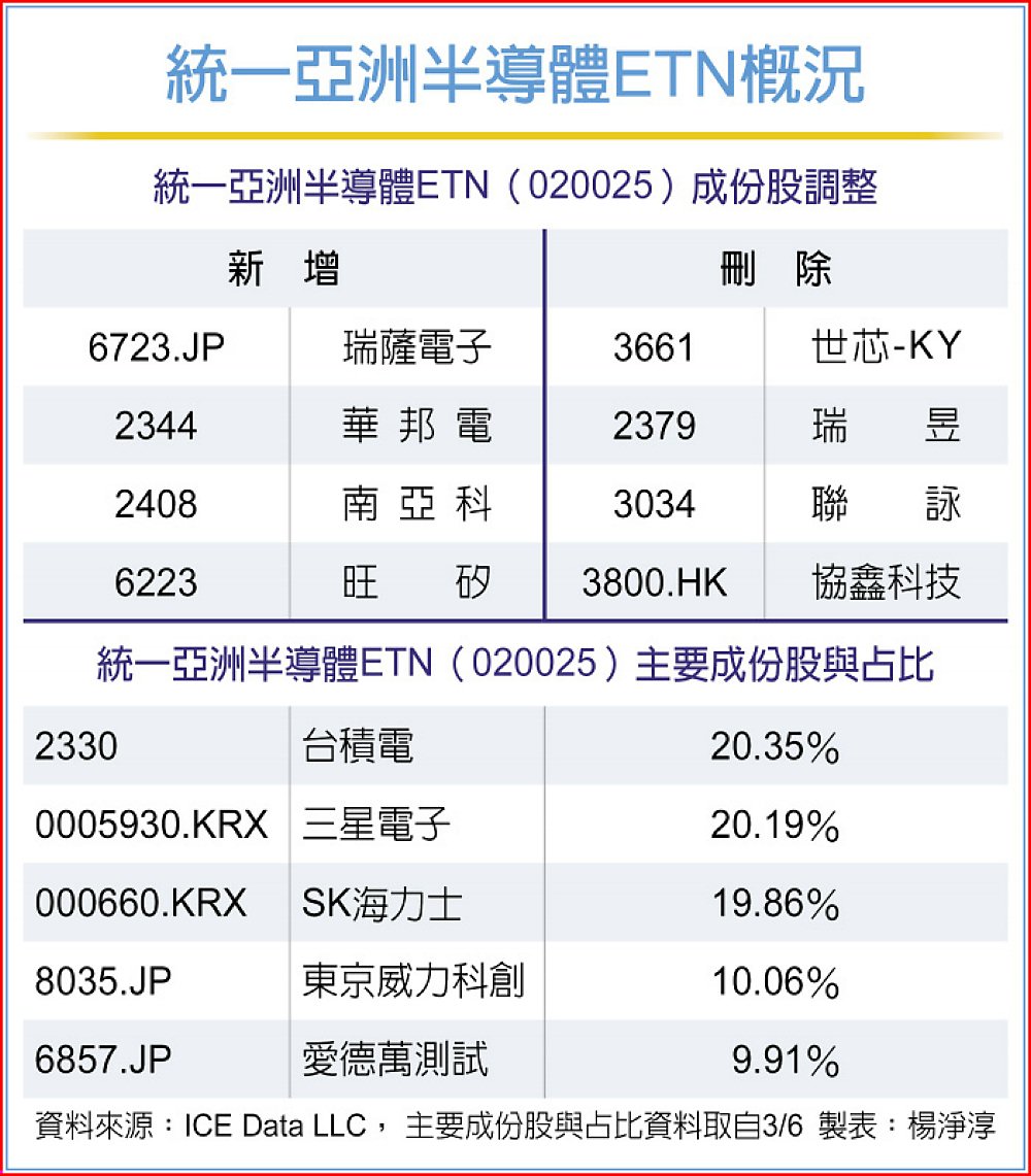 統一亞洲半導體ETN(020025)追蹤「NYSE FactSet 亞洲半導體淨報酬指數」,權重集中於台、韓、日三地最具戰略地位的半導體企業;亞股近日經歷美伊戰爭帶來的重挫,法人認為避險情緒消化後,資金還是會重新聚焦基本面以及產業趨勢。預期今年至2027年將是全球記憶體供應最緊縮的期間,第一季報價有望創下季增80%的歷史紀錄。