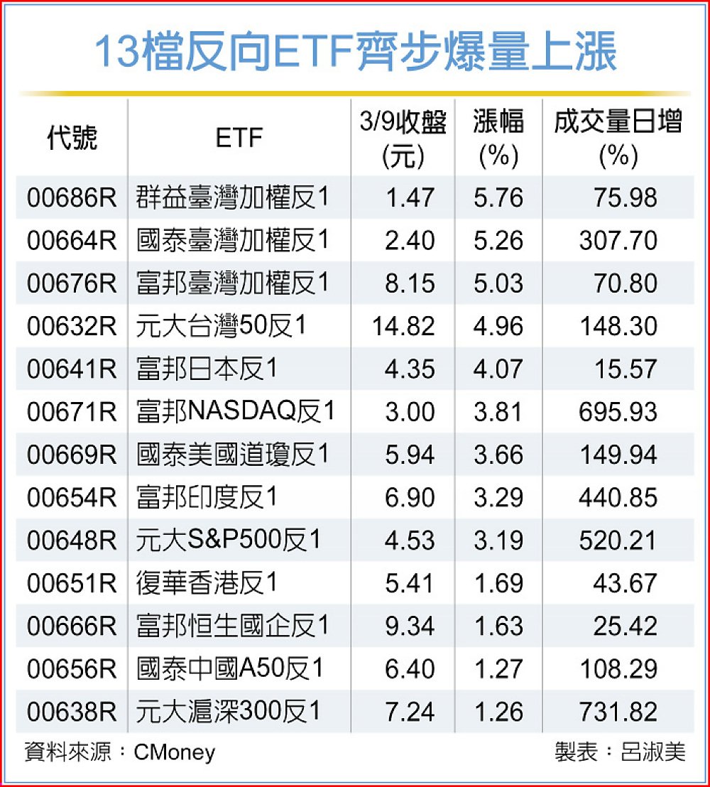 據9日統計,與台股、美股、陸股、港股、日股及印度等股市連動的反向ETF齊上飆漲,尤其群益臺灣加權反1(00686R)、國泰臺灣加權反1(00664R)、富邦臺灣加權反1(00676R)等3檔台股反向ETF齊步大漲5%以上,最亮眼。