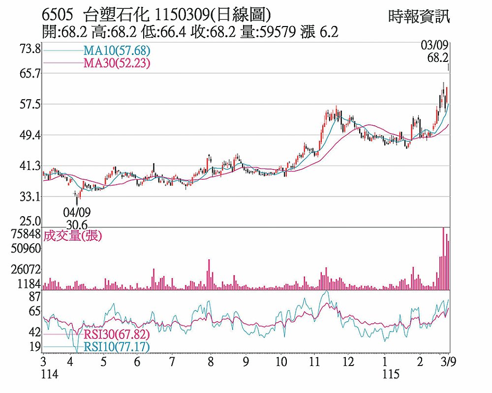 台塑化(6505)因美伊衝突,荷姆茲海峽遭伊朗封鎖,國際油價應聲大漲,杜拜原油報價飆破每桶100美元,股價持續強漲,9日一早即直奔漲停,以68.2元改寫近一年八個月新高,成交量5.9萬張,三大法人中,自營商續買超1,135張,惟外資調節3,016張。去年每股稅後純益1.04元,擬超額配息1.2元。該公司主要進口杜拜原油,運輸周期約三個月,在成本與產品報價間存在時間差。短線因地緣政治推升油價急漲,有助於擴大原油與成品間的價差,進一步提升煉油利差,對營運形成正向挹注。